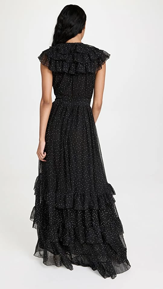 - Tiered ruffle trims at hem