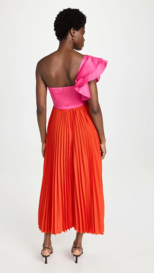 - Grosgrain ribbon at waist and allover pleating at skirt