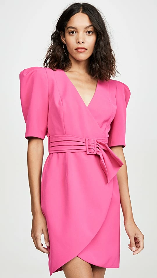 With wide shoulders and a belted waist, this elegant Black Halo mini dress effortlessly balances exaggerated and trim proportions. Add a simple pair of hoop earrings and understated sandals to the mix to complete your night-out look.