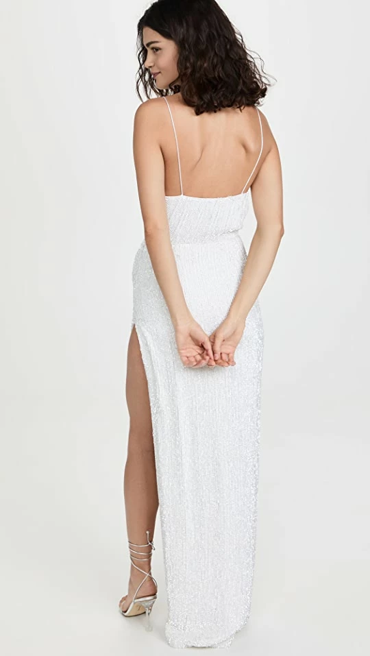 - Ruching and thigh-high slit at side